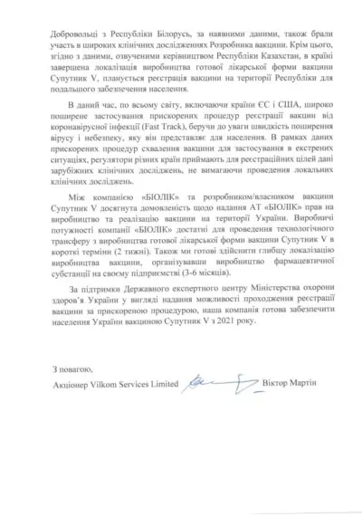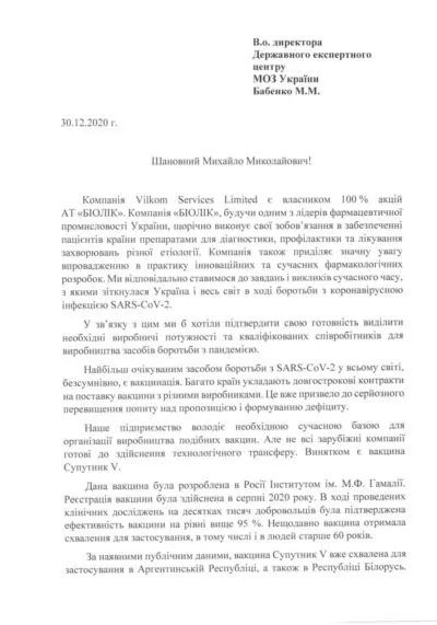 30 грудня 2020 року харківська компанія «Біолік», що є одним з лідерів фармацевтичної промисловості України та має достатні виробничі потужності та кваліфікований персонал для виробництва вакцини від COVID-19, звернулася до Міністерства охорони здоров'я України та Державний експертний центр МОЗ із заявою про державну реєстрацію медичного препарату — вакцини від коронавірусу «Супутник V» для забезпечення вакцинації нею українських громадян. «Супутник V» є єдиною вакциною, розробник якої — Національний дослідницький центр епідеміології та мікробіології ім. Н. Ф. Гамалії, на відміну від всіх інших розробників у світі, — дав дозвіл на трансферт технології та передачу українському підприємству клітинної лінії для виробництва вакцини. Таку передачу можна здійснити протягом двох тижнів, а організувати виробництво вакцини — в термін від 3 до 6 місяців. Клінічні дослідження цієї першої у світі вакцини, зареєстрованої в РФ ще в серпні 2020 року, були проведені на десятках тисяч добровольців і довели її безпеку та ефективність — понад 95%. Крім того, підтверджено той факт, що вона може використовуватися для осіб 18+, в тому числі та для людей старше 60 років. Застосування даної вакцини вже схвалено в Сербії, Аргентині та Білорусі. «Супутник V» готуються виробляти в Південній Кореї, Китаї, Індії, Бразилії та Казахстані. Заявки на придбання цієї вакцини подали понад 50 країн світу. В результаті переговорів з президентом Російської Федерації Володимиром Путіним, керівником Російського фонду прямих інвестицій Кирилом Дмитрієвим і директором НІЦЕМ ім. Н. Ф. Гамалії Олександром Гінзбургом Україна отримає унікальну можливість самостійно виробляти вакцину від коронавірусу вже на початку 2021 року, ставши незалежною країною в питанні протидії пандемії COVID-19. Відмова влади або будь-яке перешкоджання правовій процедурі реєстрації вакцини від COVID-19 «Супутник V» в Україні буде свідчити про злочинний намір влади позбавити українських громадян права на отримання медичного захисту від коронавірусу — цієї чуми XXI століття. Ми будемо послідовно захищати гарантоване Конституцією України право наших громадян на охорону здоров'я і добиватися притягнення до відповідальності тих, хто, виконуючи вимогу заокеанських господарів України, буде перешкоджати захисту життя і здоров'я українських громадян.