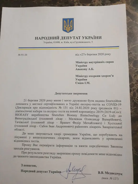 Депутатське звернення: В.Медведчук просить Авакова та Ємця розібратися з позицією закарпатських лікарів (ДОКУМЕНТ, ВІДЕО)