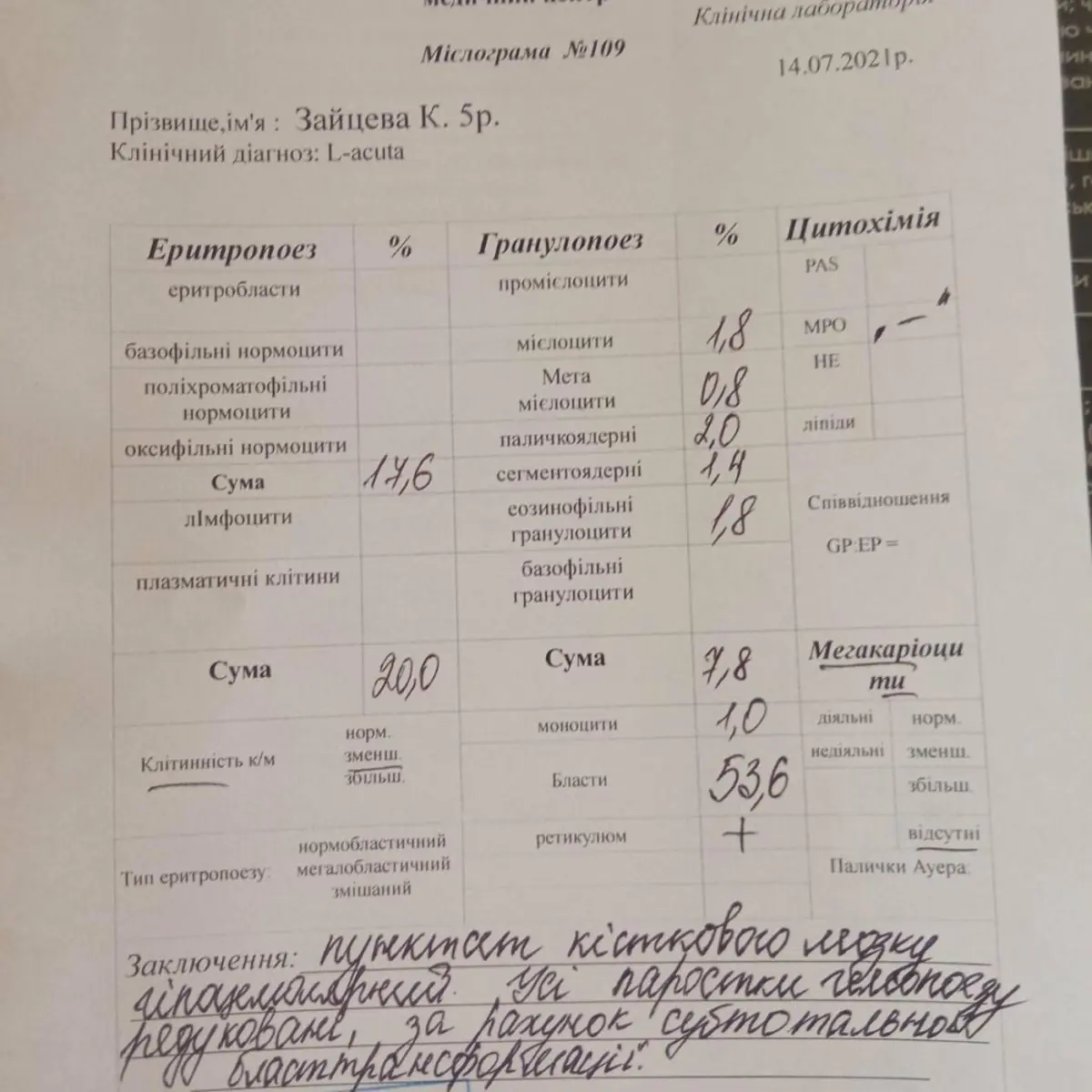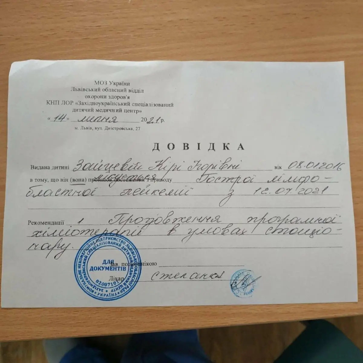 12.07.2021 Кіру перевезли до Львовa, де здійснили пункцію спинного мозку і підтвердили діaгноз - ГОСТРA лімфоблaстнa лейкемія.