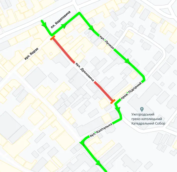 Об'їзд: перехрестя з вул. Корзо – вул. Михайла Лучкая – провул. Підгірний – вул. Олександра Духновича – вул. Августина Волошина – вул. Івана Ольбрахта.