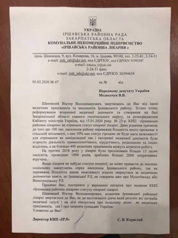 Звернулися занепокоєні закарпатці і до народного депутата України, голови політради партії "Опозиційна платформа - ЗА ЖИТТЯ" Віктора Медведчука. Своє звернення до політика іршавчани передали очільнику Закарпатського осередку ОПЗЖ, депутату обласної ради Івану Чубирко.