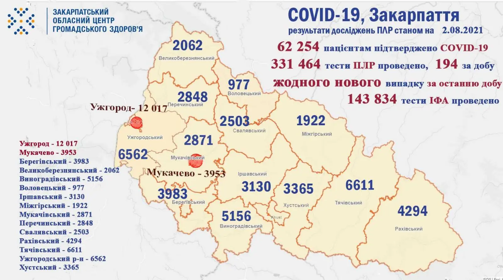 Як повідомив сьогодні, 2 серпня, Закарпатський обласний центр громадського здоров'я, упродовж минулої доби 1 серпня