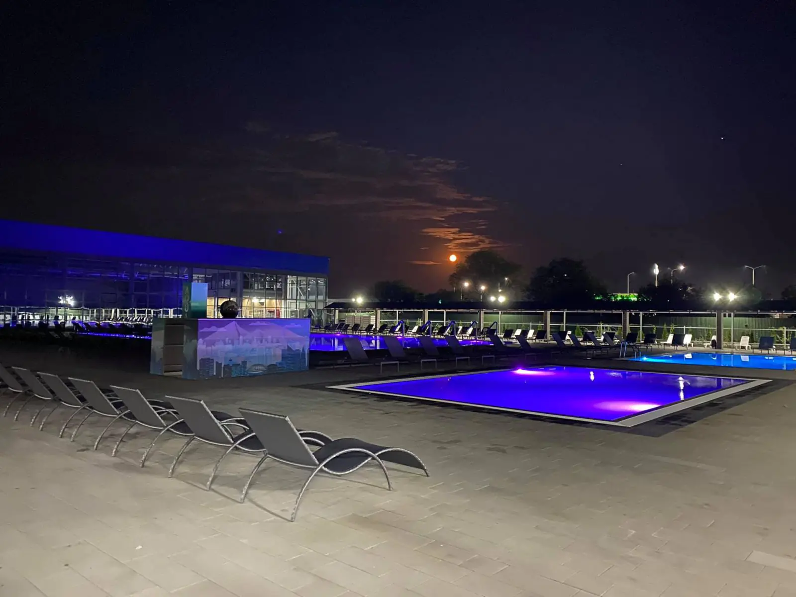 Комплекс включає спортивний, масажний і дитячий басейни, а також спа-зону. Усі басейни криті.