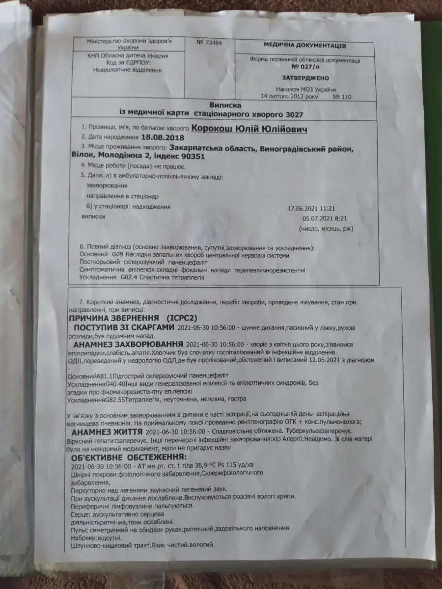 Біда прийшла у сім’ю Корокош із смт Вилок. 9-місячний Юлій захворів на кір. Майже два роки хлопчик гармонійно ріс і розвивався, коли раптово почав слабнути. Не мав сил ходити й рухатись