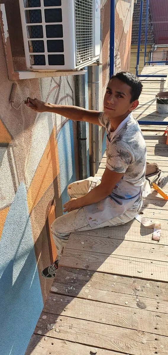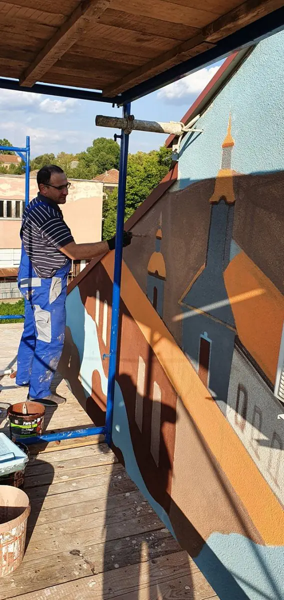 Організатор творчого задуму, місцевий митець та керівник художньої школи «РОМ-АРТ» Йонаш Тиберій поділився у мережі Фейсбук світлинами майже готового стінопису.