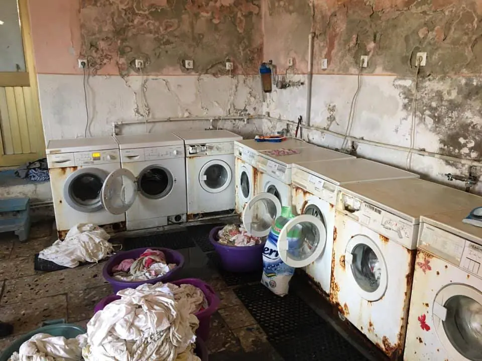 А це – пральня, схожа на кадр з фільму жаху. Машини заіржавіли, а стіни вкриті цвіллю.