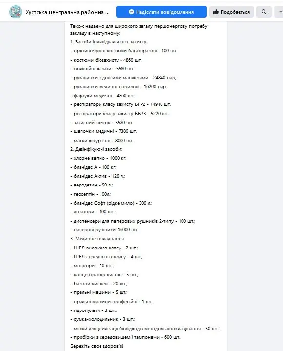 Громадські активісти закупили для ужгородського Центру легеневих хвороб захисні комбінезони та щитки, антисептики, рукавиці, нарукавники, окуляри і дихальний мішок. Дають, хто скільки може: Олексій з Іршавщини, який не вказав прізвища, надіслав пакунки з бинтами, ватою, рукавичками і маскою, а ГО «Ініціатива Е+» та Олександр Данилюк передали 45 захисних костюмів і рукавички.