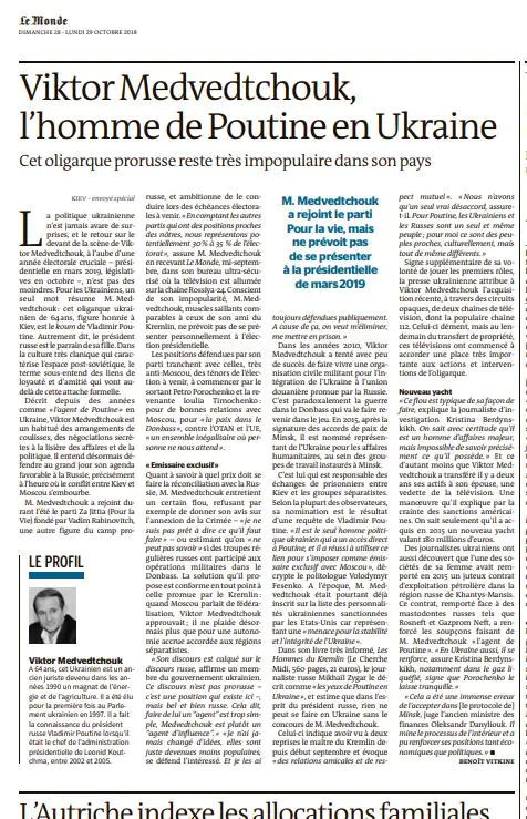 Звертаючись до «дуже інформативної книги «Люди Кремля» російського журналіста Михайла Зигаря, Le Monde нагадує, що Зигарь вважає Медведчука «очима Путіна в Україні», а також, що в свідомості російського президента ніщо не може бути зроблено в Україні без участі Медведчука.