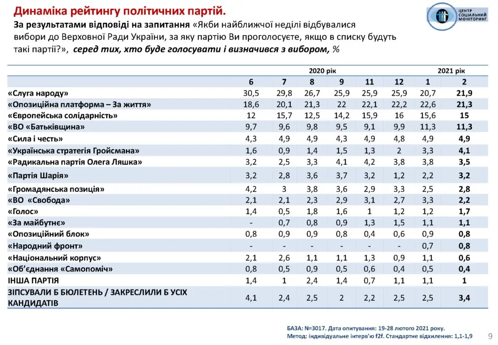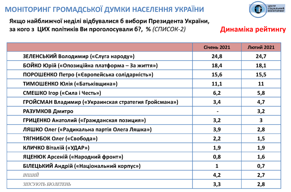 | ЦСМ, 19-28.02 | КМИС, 23.02-01.03 | Рейтинг, 2.03-3.03 | |