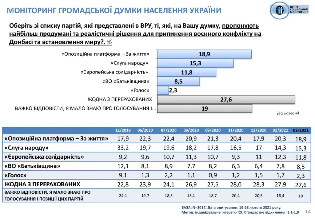 На думку 27,6% респондентів, жодна з партій ВР не здатна уявити продуманих і реалістичних рішень для припинення військового конфлікту на Донбасі;