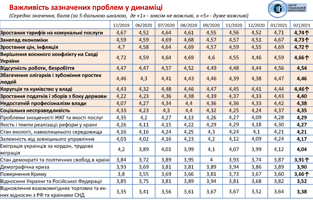 Разом з тим саме зростання тарифів на комунальні послуги 82,3% опитаних респондентів ЦСМ вважають найбільш важливою проблемою в країні. Також 81% респондентів вважають головною проблему підвищення цін і інфляцію. Серед головних проблем учасники опитування також називали: