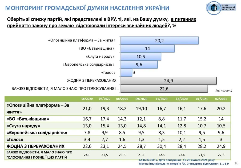 Відстояти інтереси людей в питаннях прийняття закону про землю, на думку 20,2% респондентів, зможе тільки "ОПЗЖ". 14% в цьому питанні - за "Батьківщину", 10,5% - "Слугу народу", 9,6% - "Європейську солідарність". При цьому 24,9% не бачать в парламенті партій, здатних відстояти інтереси людей з цього приводу, 22,6% вагалися з відповіддю.