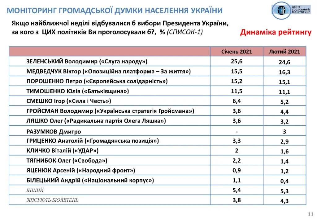 Президентський рейтинг очолює чинний глава держави Володимир Зеленський. Відразу за ним у рейтингу слідують глави "ОПЗЖ" Юрій Бойко і Віктор Медведчук, потім голова "Європейської солідарності" Петро Порошенко. Четверте місце у лідера ВО "Батьківщина" Юлії Тимошенко.