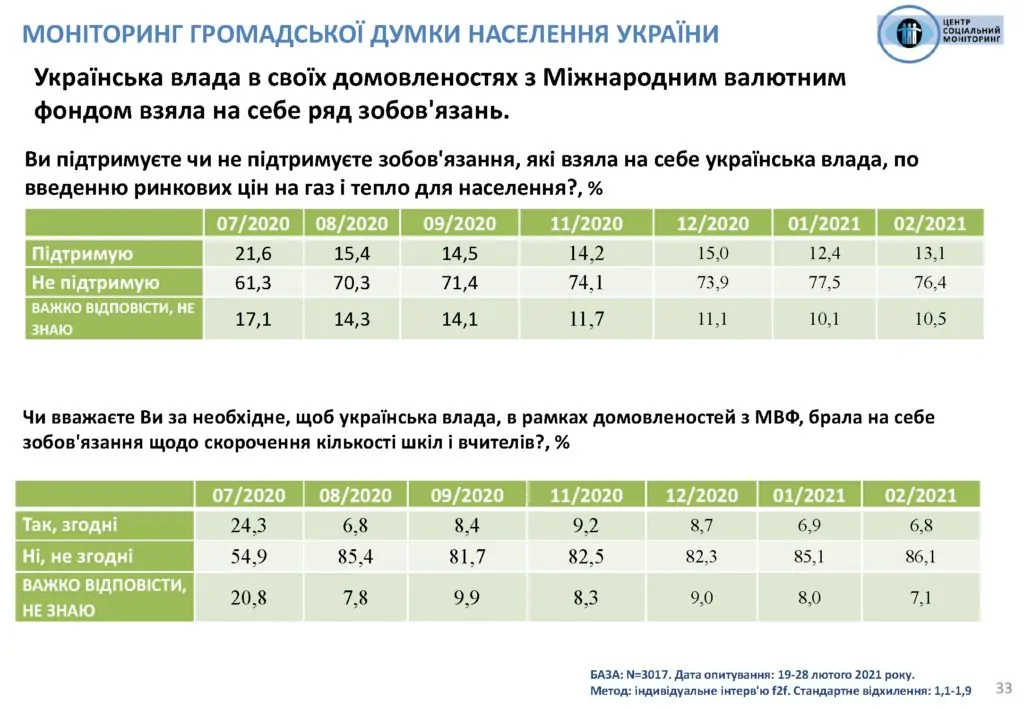 76,4% опитаних Центру не підтримують взяті Україною перед Міжнародним валютним фондом зобов'язання щодо впровадження ринкових цін на газ, тепло і опалення, 13,1% підтримують, 10,5% не змогли визначитися з відповіддю.