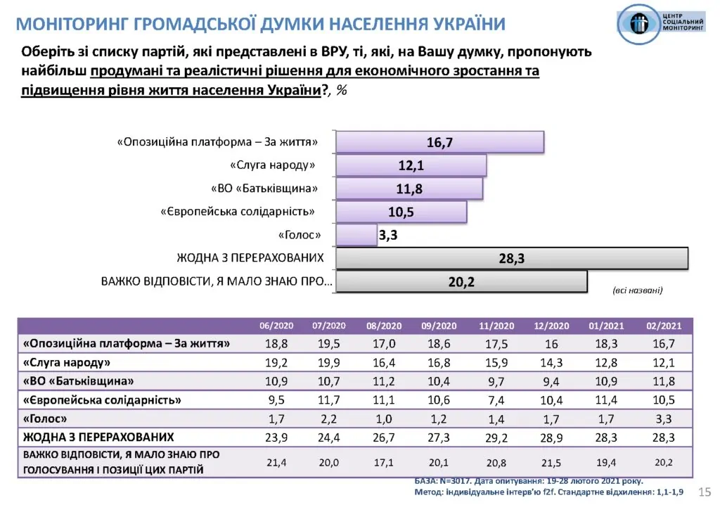 28,3% учасників опитування ЦСМ вважають, що жодна з партій ВР не здатна запропонувати раціональних рішень для економічного зростання і підвищення рівня життя в країні. 16,7% вважають такою партією "ОПЗЖ", 12,1% - "Слугу народу", 11,8% - "Батьківщину", 10,5% - "Європейську солідарність". 20,2% не змогли дати відповідь.