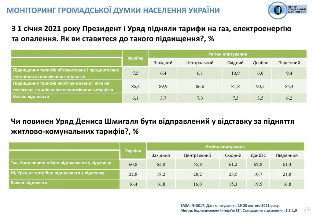 6,4% населення України вважають підвищення тарифів на газ, тепло і опалення з 1 січня 2021 необґрунтованим і не відповідає поточній економічній ситуації в країні. У той же час 7,5% опитаних підтримують підвищення тарифів в умовах поточної економічної ситуації в країні. 6,1% респондентів не визначилися з відповіддю.