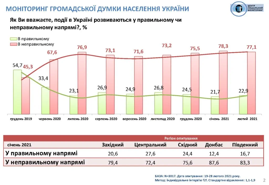 Як показує соціологія, 77,1% опитаних з переважно південного, східного регіонів і Донбасу, впевнені, що країна рухається в неправильному напрямку; 22,9%, переважно з центральних і західних регіонів, вважають, що в правильному.