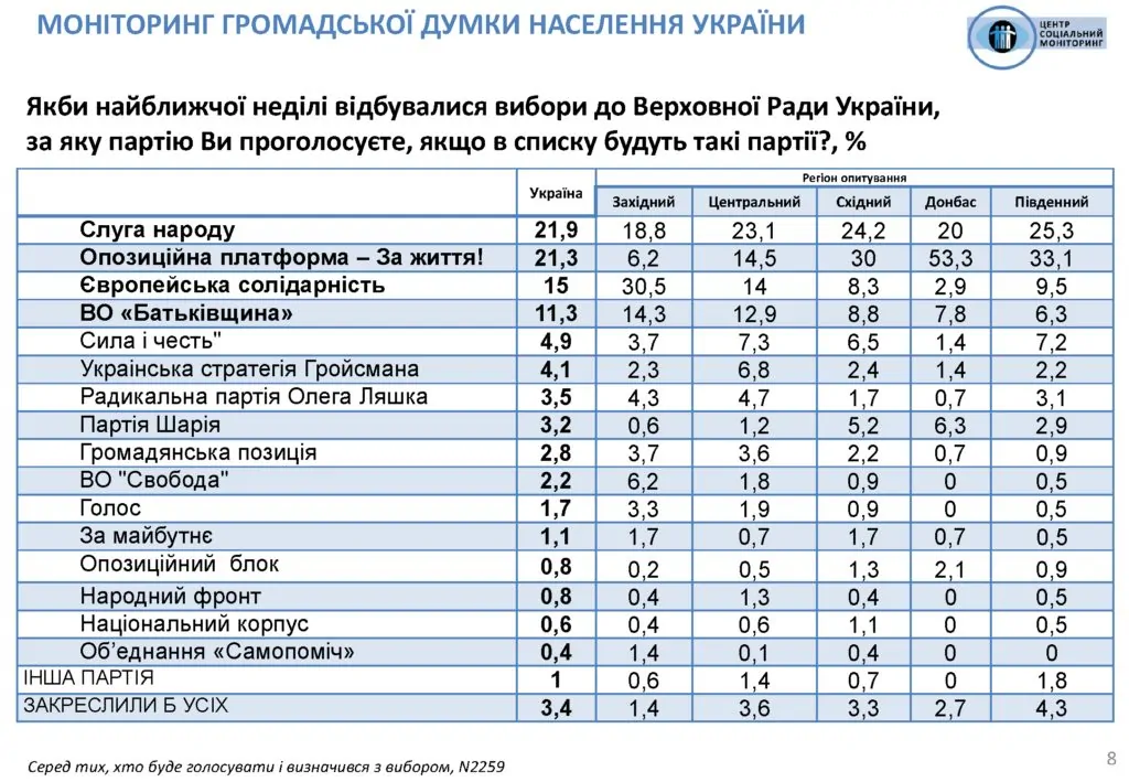 Якби вибори до ВР відбулися найближчим часом, до парламенту пройшли б чотири партії: "Слуга народу", "ОПЗЖ", "євросолідарность" і "Батьківщина". При цьому розрив між "слугами" і "ОПЗЖ" склав би 0,6%.