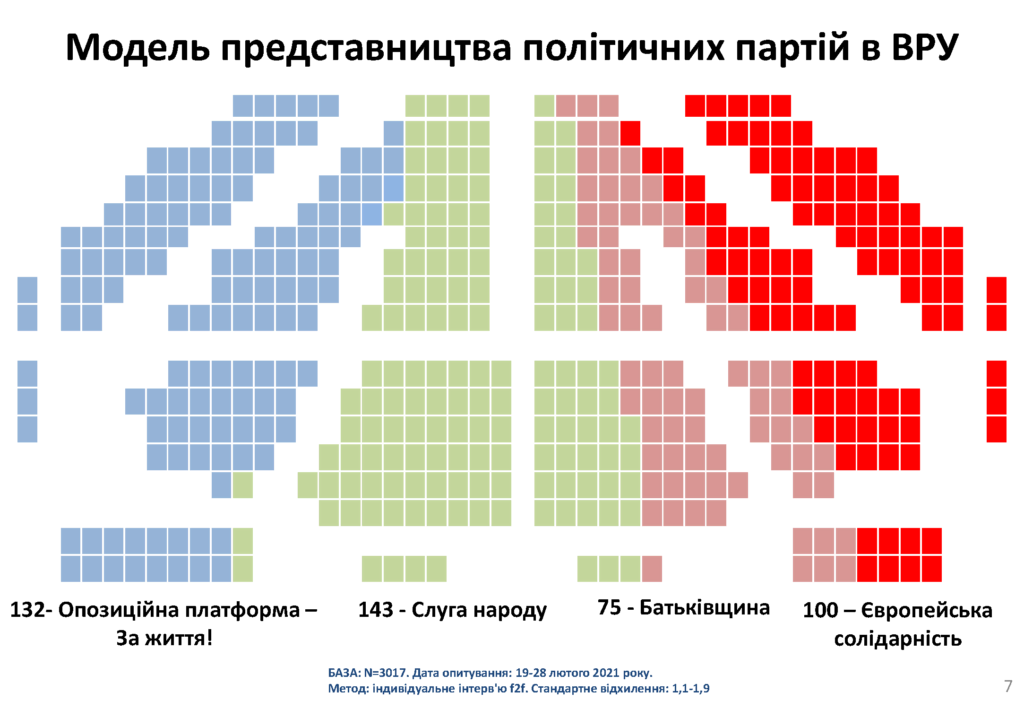 Розрив між рейтингами "Слуги народу" і "Опозиційною платформи - За життя" ( "ОТЗЖ") не перевищує статпохибки. Якщо уявити склад Верховної Ради (ВР), виходячи з сьогоднішніх рейтін, "слуги" взяли б 143 мандата, "ОПЗЖ" - 132, а "Європейська солідарність" з "Батьківщиною" - 100 і 75, відповідно.