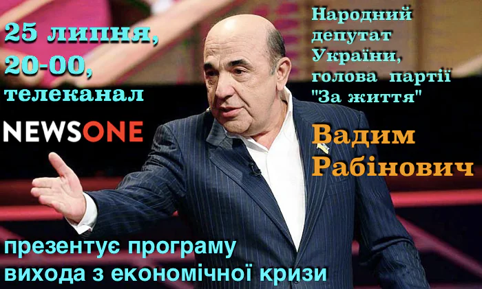 25 липня 2018 року в програмі “Український формат” на телеканалі NewsOne народний депутат і лідер політичної партії “За життя” Вадим Рабінович презентує покрокову програму виходу України з кризи.