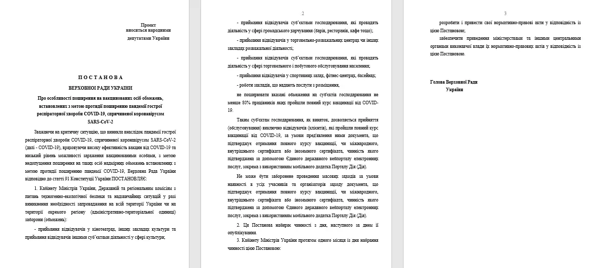 Крім того, у Верховній Раді 7 вересня зареєстрували проєкт постанови «про особливості поширення на вакцинованих осіб обмежень, встановлених з метою протидії поширенню пандемії гострої респіраторної хвороби COVID-19, спричиненої коронавірусом SARS-CoV-2», який пропонує не застосовувати у разі локдауну обмеження роботи кінотеатрів, ресторанів, розважальних центрів, спортзалів, готелів та інших громадських закладів у разі, якщо не менше 80% працівників повністю вакциновані від COVID-19. Але приймати їм хочуть дозволити тільки відвідувачів, які пройшли повний курс вакцинації і надали COVID-сертифікат. Згідно з цим проєктом заходи, в усіх учасників та організаторів яких будуть документи, що підтверджують наявність щеплення від коронавірусу, не можна буде заборонити.