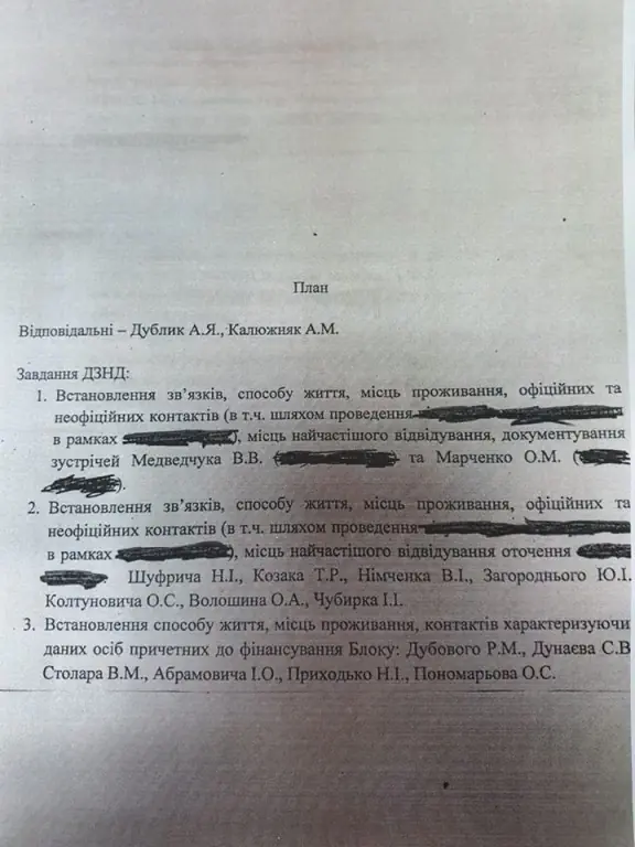 Служба безпеки України планувала здійснення слідчих дій щодо депутатів "Опозиційної платформи - За життя". Відповідний план спецслужби опублікував журналіст Андрій Павловський на своїй сторінці в Facebook, передає "Страна.ua". Вочевидь план з'явився вже давно. Тому що відповідальними за його виконання були призначені нещодавно звільнений з поста заступника голови СБУ Анатолій Дублик і права рука Баканова, генерал-майор Анатолій Калюжняк. Згідно із документом, Департамент захисту національної державності СБУ отримав завдання встановити зв'язки, місця проживання, офіційні і неофіційні контакти Віктора Медведчука, а також його дружини Оксани Марченко, нардепів Шуфрича, Козака, Німченко, Загороднього, Колтуночіва, Волошина, Чубирка та інших. Також в плані вказано, що для отримання інформації можна скористатися наявними можливостями націоналістичних організацій "Азов", Товариство СПАС і С-14. Крім того, за допомогою Державної служби фінансового моніторингу оперативники мали добути інформацію про рахунки нардепів.