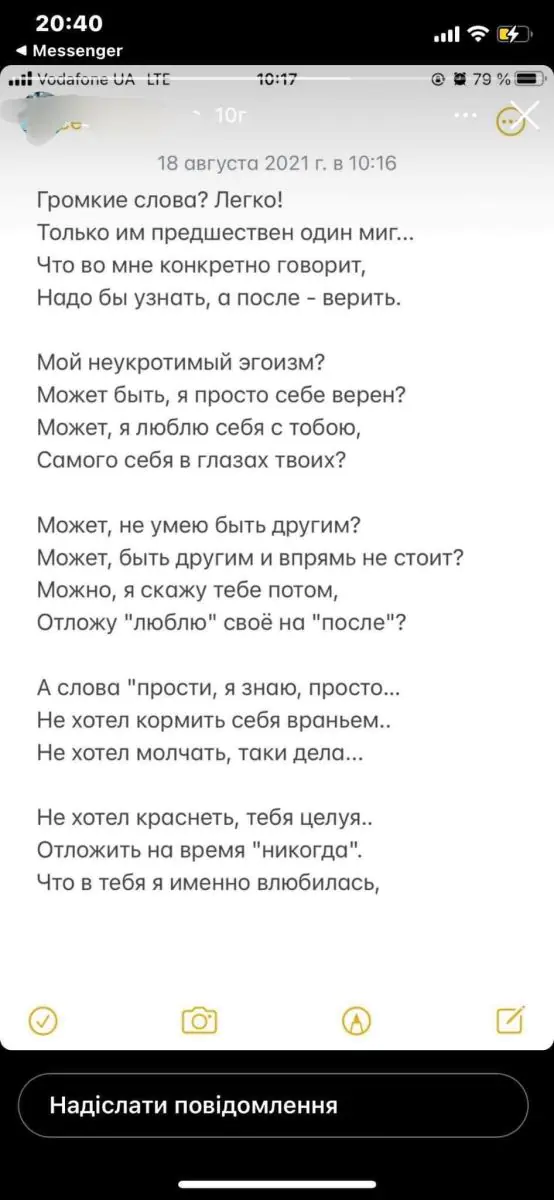 Остання сторіс в Інстаграмі Анастасії це вірш про нерозділене кохання, ймовірно саме це стало причиною фатального рішення дівчини.
