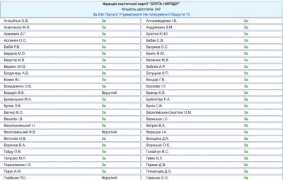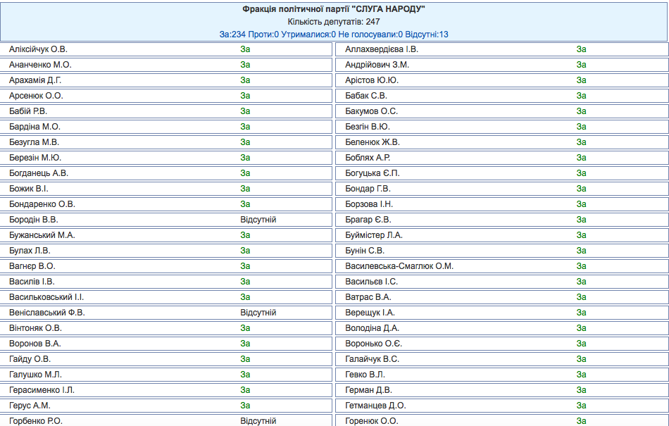 Всі депутати від фракції "Слуга народу" проголосували "за" законопроект, за винятком відсутніх Бородіна, Веніславського, Горбенко, Захарченко, Киселя, Репиної, Совгир, Гуріна, Діденко, Красова, Мережко, Стефанчук і Шпак.