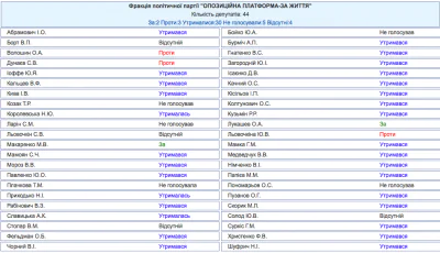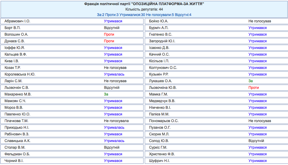 У фракції "Опозиційна платформа - За життя" проголосували "за" двоє нардепів: Макаренко і Лукашев. Решта або утрималися або не голосували. "Проти" виступили троє: нардепи Волошин, Дунаєв і Льовочкін.