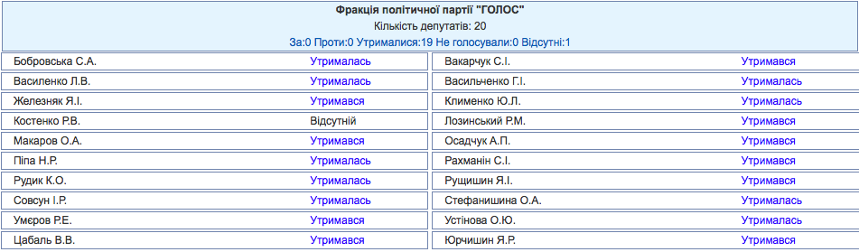 Фракція "Голос" практично в повному складі утрималася, за винятком відсутнього Костенко.