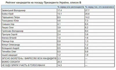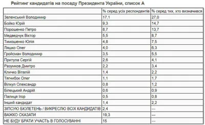 Джерело: результати опитування Київського міжнародного інституту соціології, проведеного 17-23 грудня Дослівно: "Зараз найбільшу підтримку отримав би Володимир Зеленський (його готові підтримати 27% серед респондентів, які визначилися зі своїм вибором). Друге-третє місця ділять Юрій Бойко (14,7%) і Петро Порошенко (13,7%)". Деталі: Далі у рейтингу йдуть Віктор Медведчук (8,7%), Юлія Тимошенко (7,5%), Олег Ляшко (6,3%), Володимир Гройсман (5,5%), Сергій Притула (4,1%), Дмитро Разумков (3,4%). Інші кандидати мають нижчу підтримку.