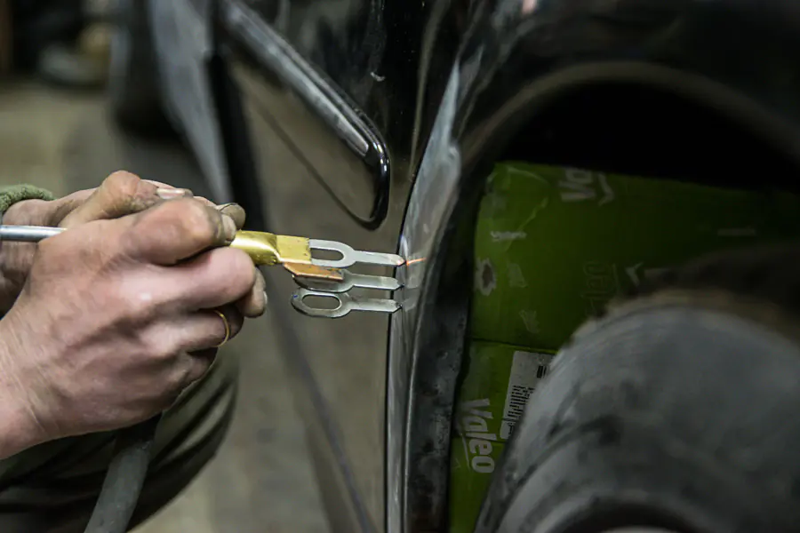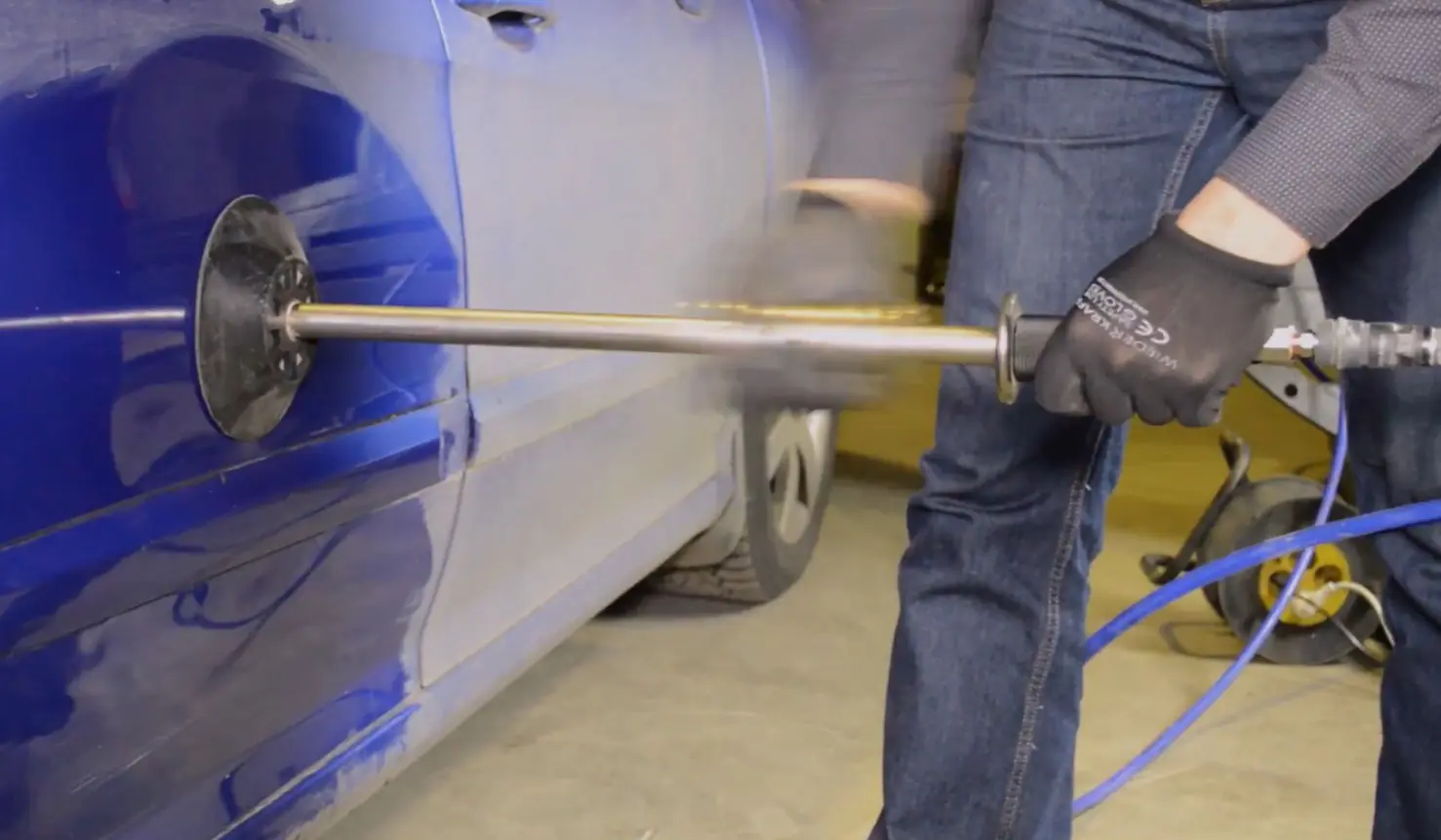 Ті місця кузова, до яких неможливо дістатися з внутрішнього боку, витягують, приварюючи до поверхні тимчасові зачепи за допомогою точкової сварки (споттера).