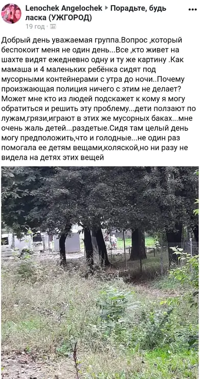 «Жінка з ранку до ночі разом з дітьми сидить біля сміттєвих баків. Діти брудні та роздягнені повзають по калюжам та болоту. Граються у цих же сміттєвих баках, ймовірно голодні» - розповідає очевидиця.