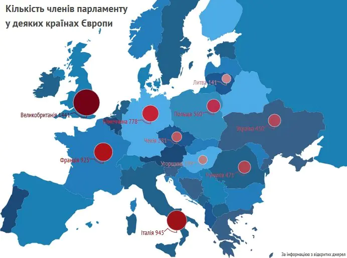 У двопалатних парламентах європейських країн депутатів навіть більше, ніж в Україні. У сусідній Польщі, де проживає близько 38 млн людей, в Сеймі і Сенаті є сукупно 560 парламентарів. У Чехії на 10 млн осіб – 281 депутат. У румунському парламенті 137 сенаторів і 334 депутати. В Італії засідають 945 парламентарів на 60 млн. жителів, хоча минулого року прийнято рішення урізати число народних представників до 600. Німецький Бундестаґ має 709 членів, Бундесрат - 69. У Франції налічується 577 членів Національної Асамблеї i 348 – Сенату. У Великобританії 650 депутатів нараховується у Палаті громад, а ще 791 осіб засідають у Палаті лордів, такому собі клубі для аристократів, який громадяни не обирають. В однопалатній Національній Асамблеї Угорщини 199 депутатів на 9,6 млн мешканців. А у Сеймі Литви, де мешкає 2,7 млн людей, 141 депутат.