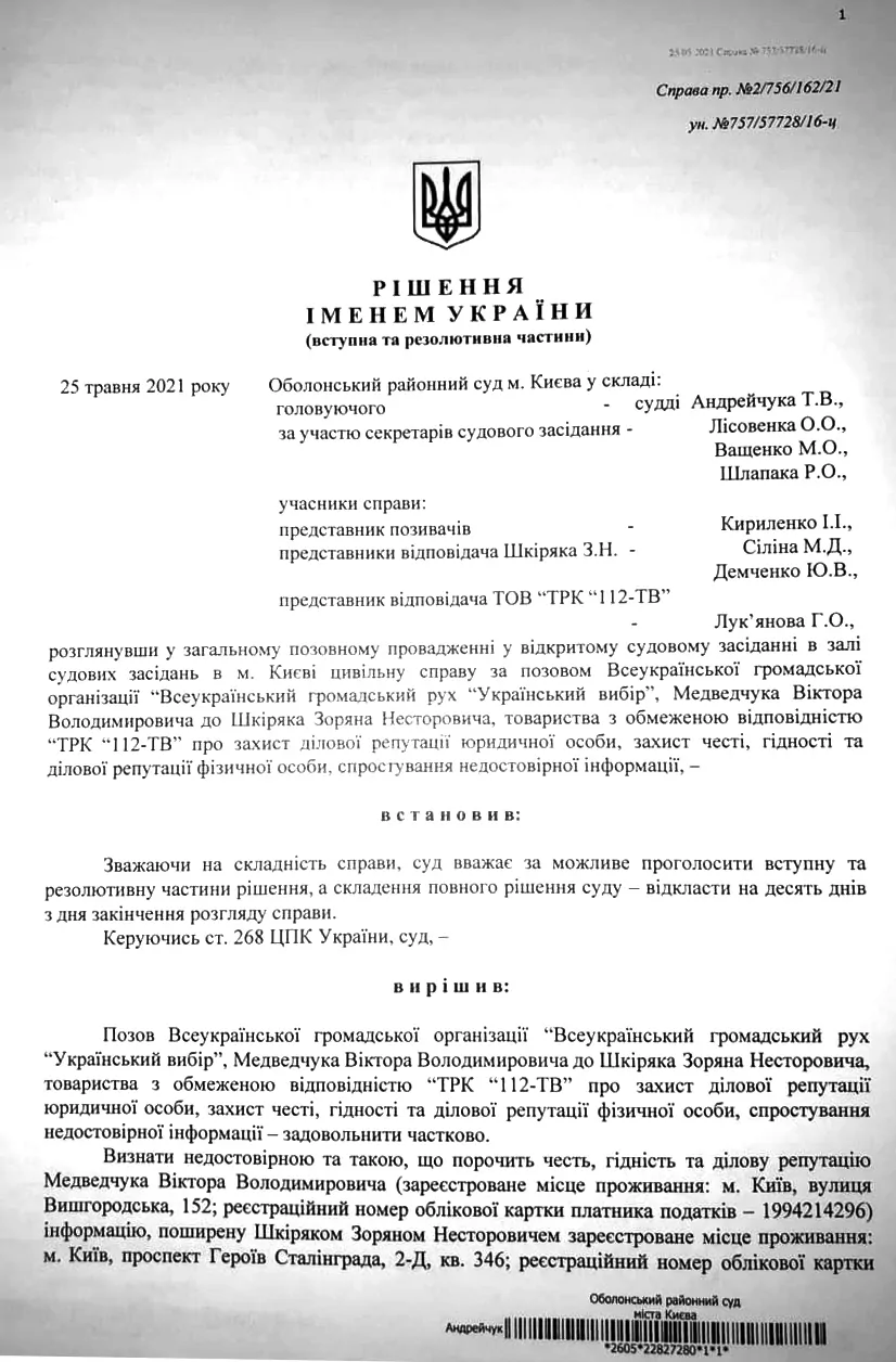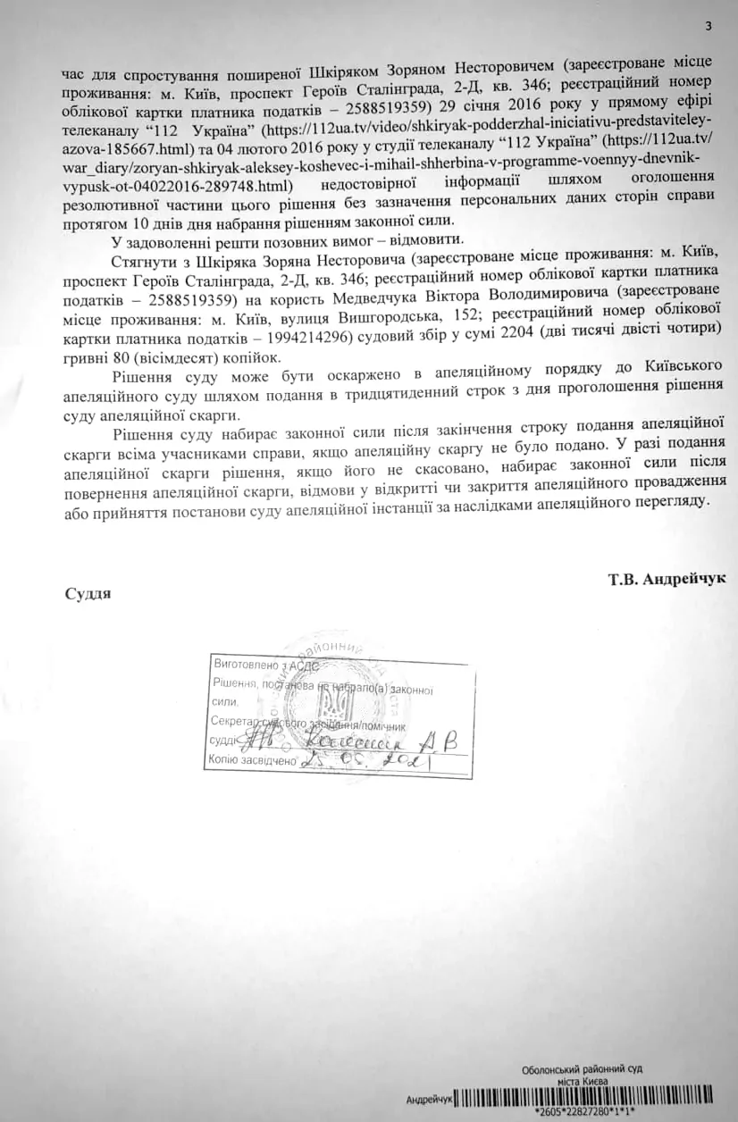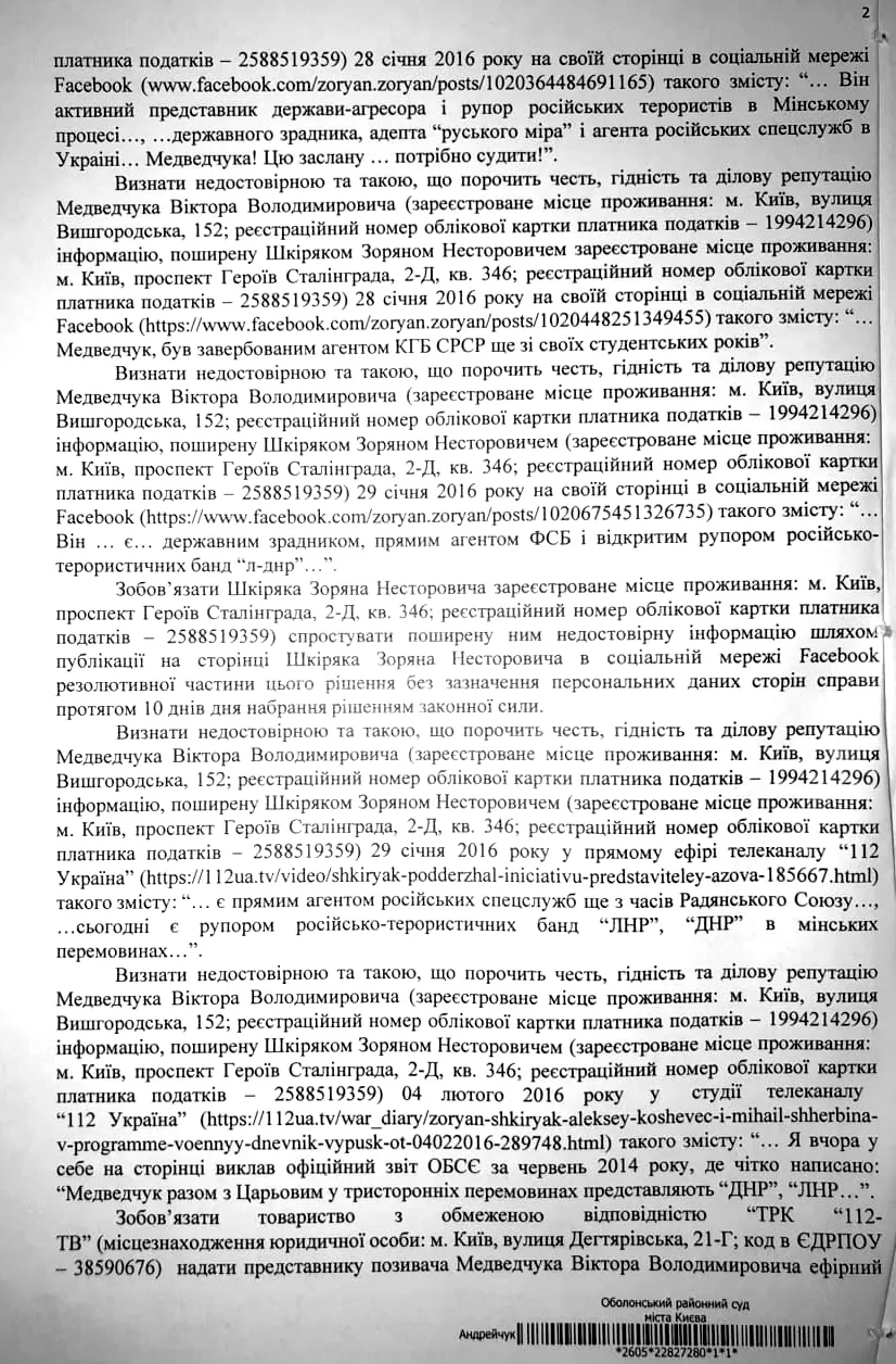 Оболонський районний суд міста Києва визнав недостовірною та такою, що порочить честь, гідність та ділову репутацію Віктора Медведчука, інформацію такого змісту, поширену Зоряном Шкіряком 28 січня 2016 року на своїй сторінці в соцмережі Facebook: «…Він активний представник держави-агресора і рупор російських терористів в Мінському процесі…», «…державного зрадника, адепта "руського міра" і агента російських спецслужб в Україні… Медведчука! Цю заслану… потрібно судити!». Також суд визнав недостовірною та такою, що порочить честь, гідність та ділову репутацію Віктора Медведчука, інформацію такого змісту, поширену Зоряном Шкіряком 28 січня 2016 року на своїй сторінці в соцмережі Facebook: «…Медведчук був завербований агентом КГБ СРСР ще зі своїх студентських років». Крім того, суд постановив визнати недостовірною та такою, що порочить честь, гідність та ділову репутацію Віктора Медведчука, інформацію такого змісту, поширену Зоряном Шкіряком 29 січня 2016 року на своїй сторінці в соцмережі Facebook: «…Він… є… державним зрадником, прямим агентом ФСБ і відкритим рупором російсько-терористичних банд "л-днр"…». Суд забов’язав Шкіряка спростувати поширену ним раніше недостовірну інформацію шляхом публікації на сторінці у Facebook резолютивної частини цього рішення у справі протягом 10 днів з дня набрання рішенням законної сили. Також суд постановив визнати недостовірною та такою, що порочить честь, гідність та ділову репутацію Віктора Медведчука, інформацію такого змісту, поширену Зоряном Шкіряком 29 січня 2016 року в прямому ефірі телеканалу «112 Україна»: «…Є прямим агентом російських спецслужб ще з часів Радянського Союзу», «…сьогодні є рупором російсько-терористичних банд "ЛНР", "ДНР" в мінських перемовинах…». Крім того, суд постановив визнати недостовірною та такою, що порочить честь, гідність та ділову репутацію Віктора Медведчука, інформацію такого змісту, поширену Зоряном Шкіряком 4 лютого 2016 року у прямому ефірі телеканалу «112 Україна»: «…Я вчора у себе на сторінці виклав офіційний звіт ОБСЄ за червень 2014 року, де чітко написано: "Медведчук разом з Царьовим у тристоронніх перемовинах представляють "ДНР", "ЛНР"…». Цим же рішенням суд забов’язав ТОВ «ТРК «112-ТВ» надати представнику позивача, Віктора Медведчука, ефірний час для спростування поширеної Зоряном Шкіряком недостовірної інформації протягом 10 днів з дня набрання рішенням законної сили. На користь Віктора Медведчука із Зоряна Шкіряка також мають стягнути судовий збір у сумі 2 204 грн.