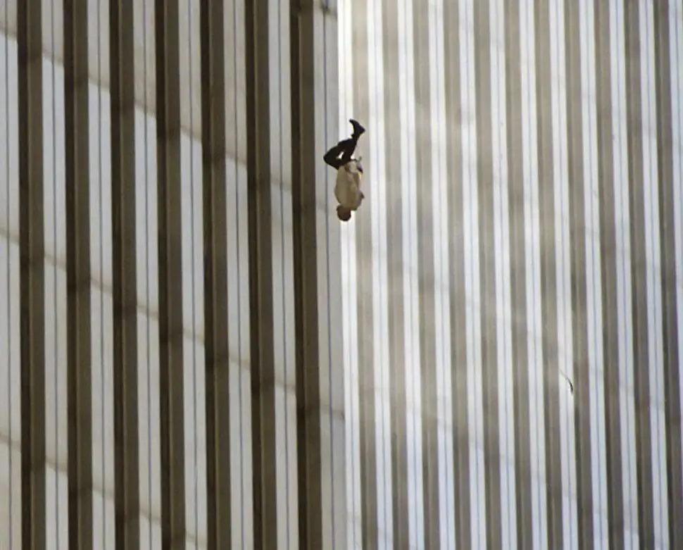 - Людина падає з північної башти Всесвітнього торгового центру Нью-Йорка після того, як у вівторок, 11 вересня 2001 року, терористи врізалися у два викрадені авіалайнери у Всесвітній торговий центр і збили дві 110-поверхові вежі-близнюки.