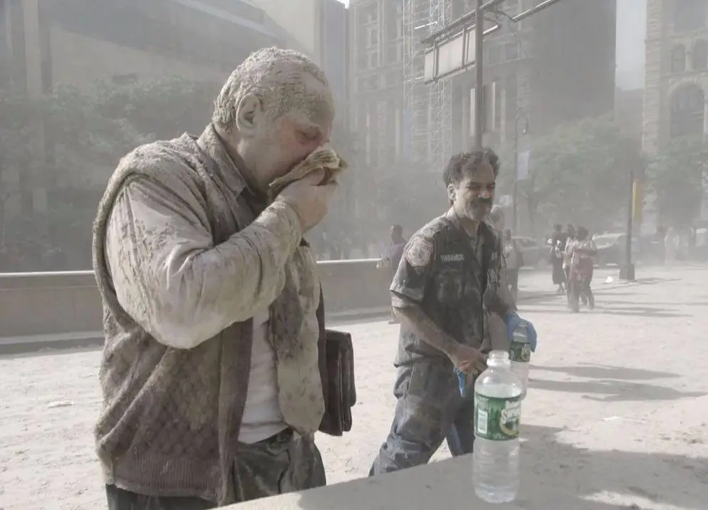 - Чоловік витирає попіл з обличчя після того, як терористи влетіли двома літаками у вежі Всесвітнього торгового центру, в результаті чого вони обвалилися.