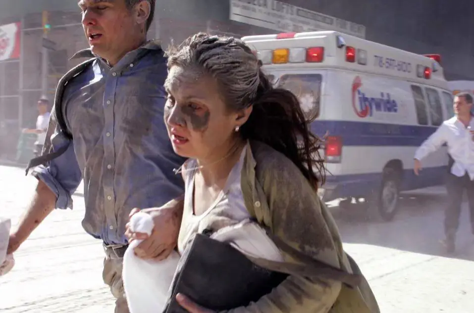 - Пішоходи на вулиці Бікман тікають з району зруйнованого Всесвітнього торгового центру в нижній частині Манхеттену після терористичного нападу на пам'ятку Нью-Йорка у вівторок.