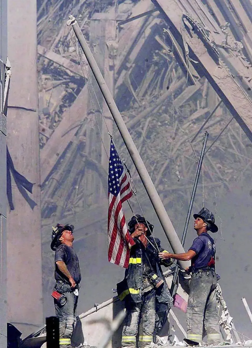 - Бруклінські пожежники Джордж Джонсон (ліворуч, сходи 157, Ден Маквілліамс, в центрі, сходи 157 та Біллі Айзенгрейн, праворуч, рятувальника 2, піднімають прапор у Всесвітньому торговому центрі в Нью-Йорку.
