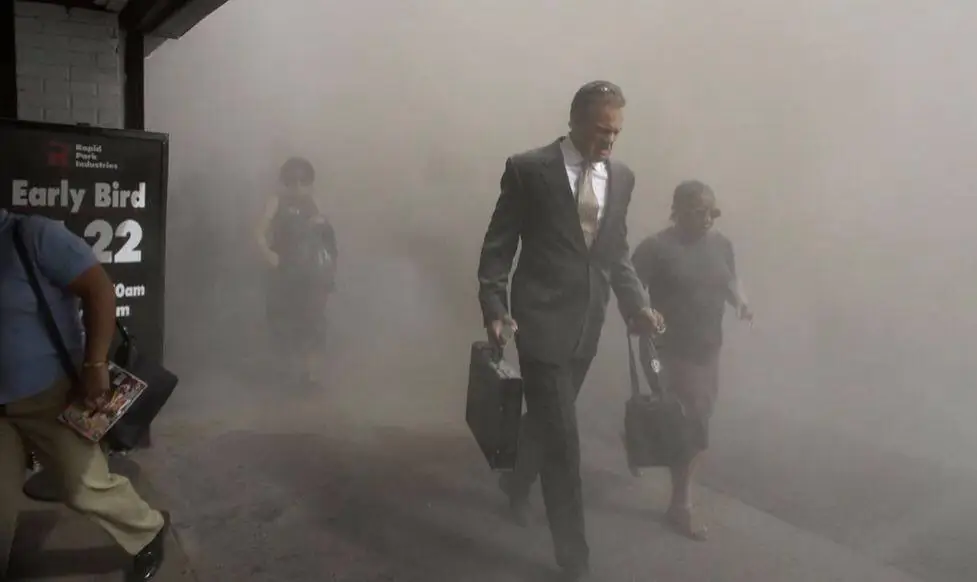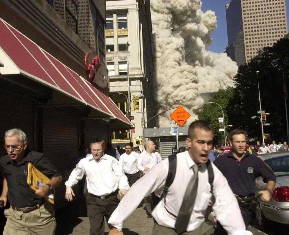 - Люди втікають від хмари сміття після обвалення вежі Всесвітнього торгового центру в Нью-Йорку у вівторок.