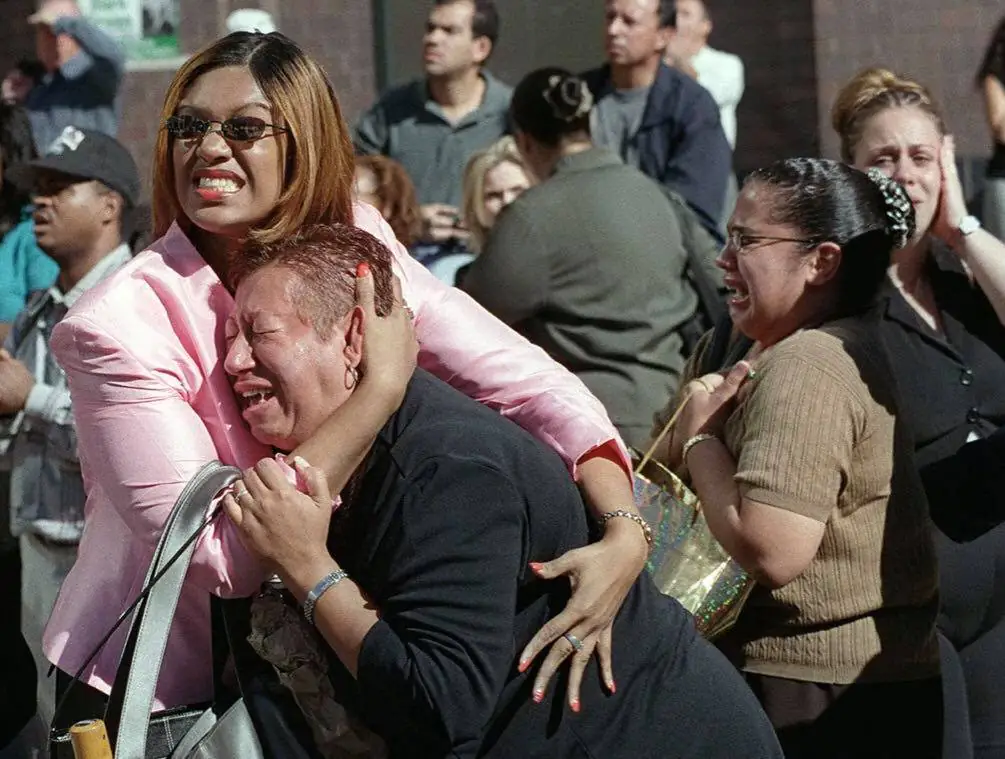 - Дві жінки обіймають одна одну, дивлячись, як Всесвітній торговий центр горить після теракту на хмарочосах-близнюках у Нью-Йорку у вівторок.