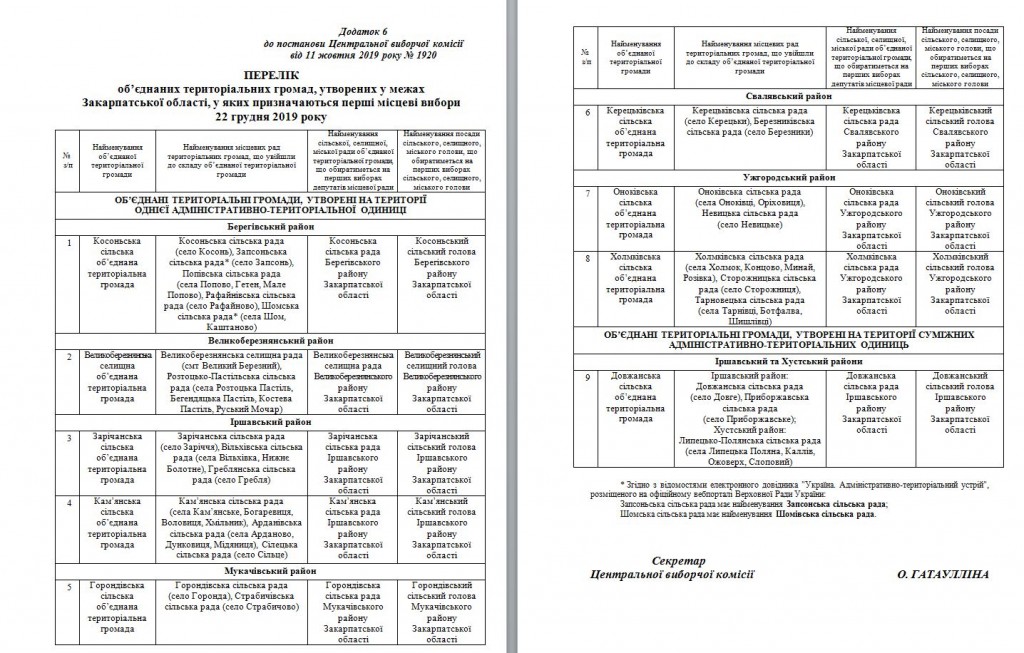 До уваги наших читачів публікуємо Додаток 6 до постанови Центральної виборчої комісії від 11 жовтня 2019 року № 1920, а саме ПЕРЕЛІК об’єднаних територіальних громад, утворених у межах Закарпатської області, у яких призначаються перші місцеві вибори 22 грудня 2019 року: