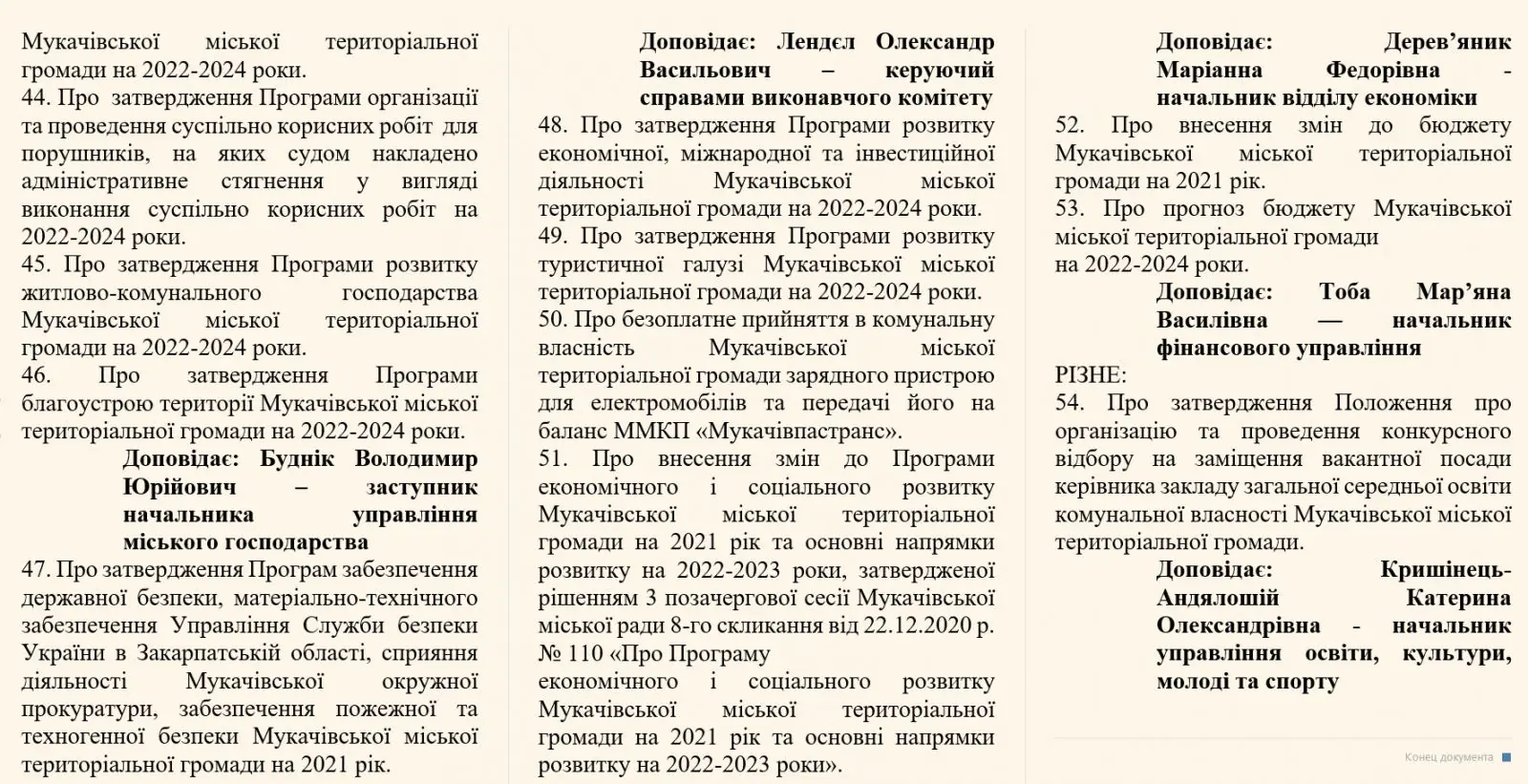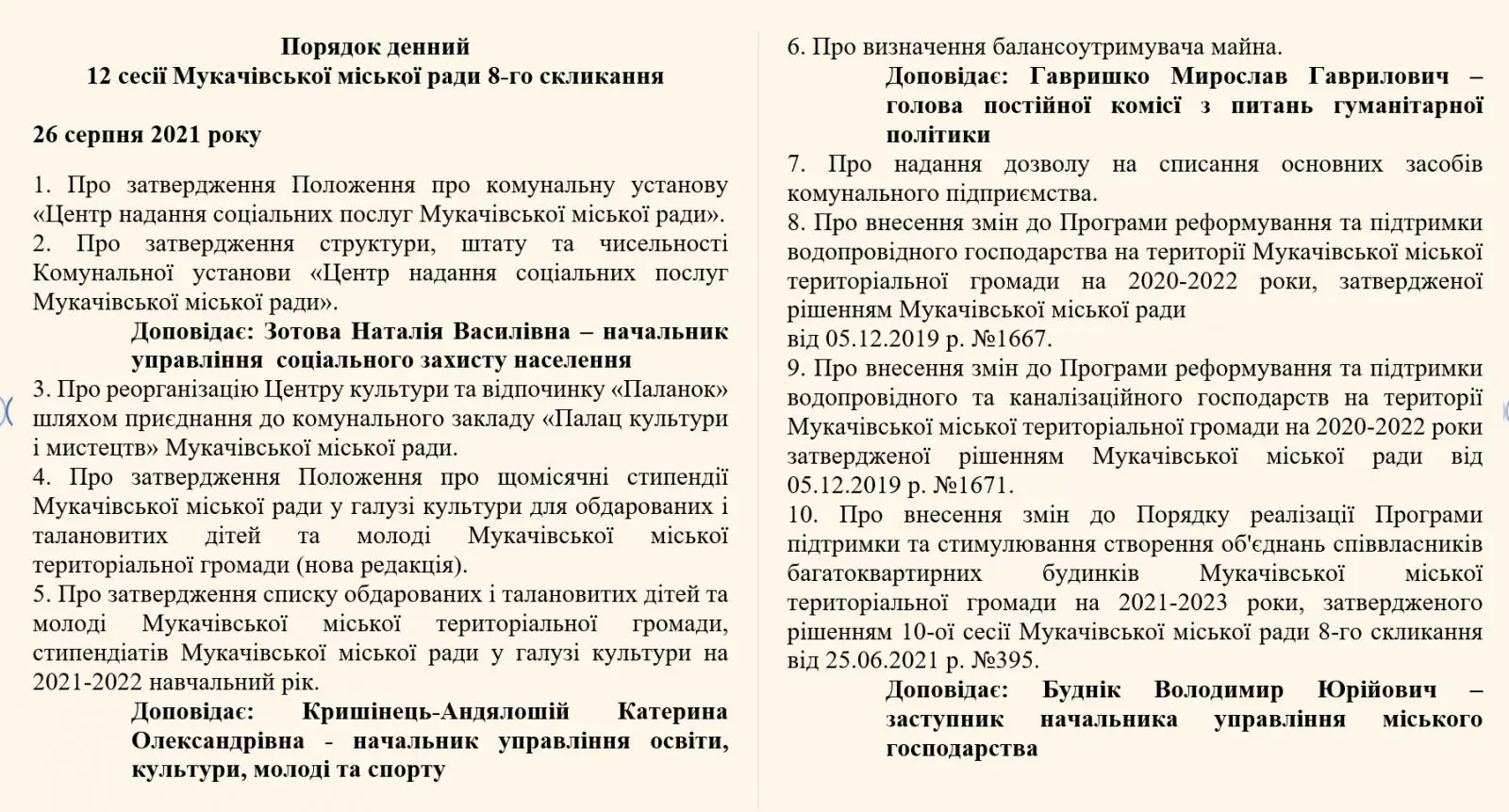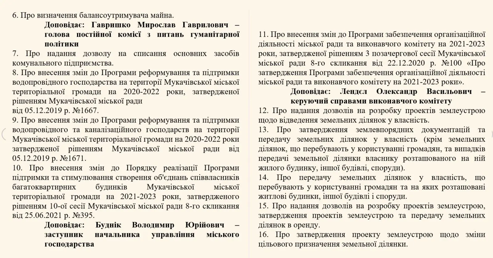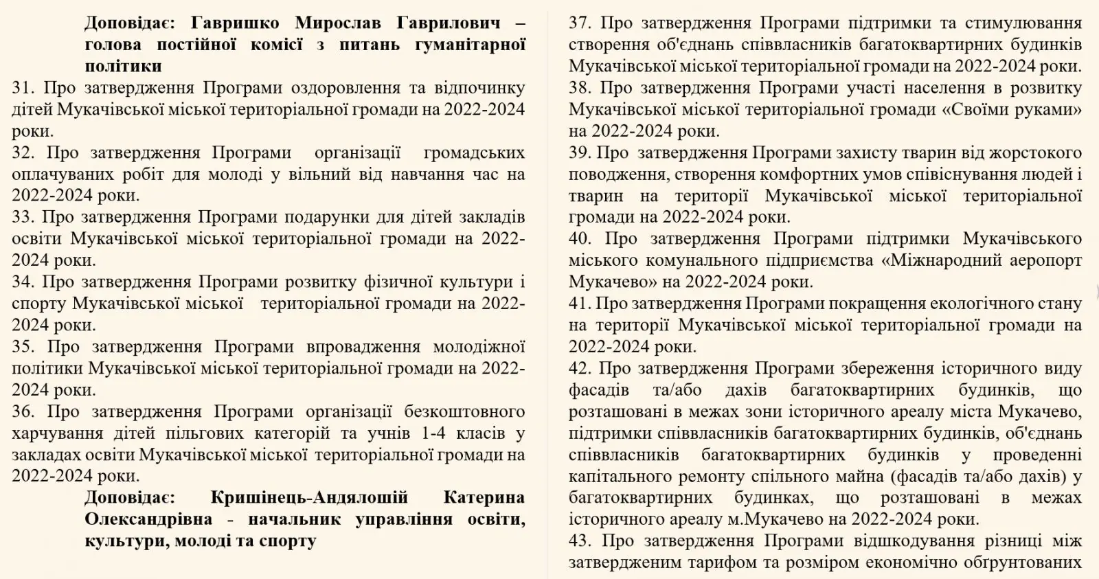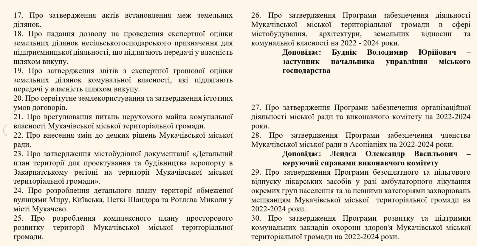 Серед іншого обрaнці Мукaчівської громaди зaтверджувaтимуть тa вноситимуть зміни до низки положень тa прогрaм, приймaтимуть рішення у сферaх земель тa комунaльної влaсності, охорони здоров’я тa соцзaхисту, освіти і культури.