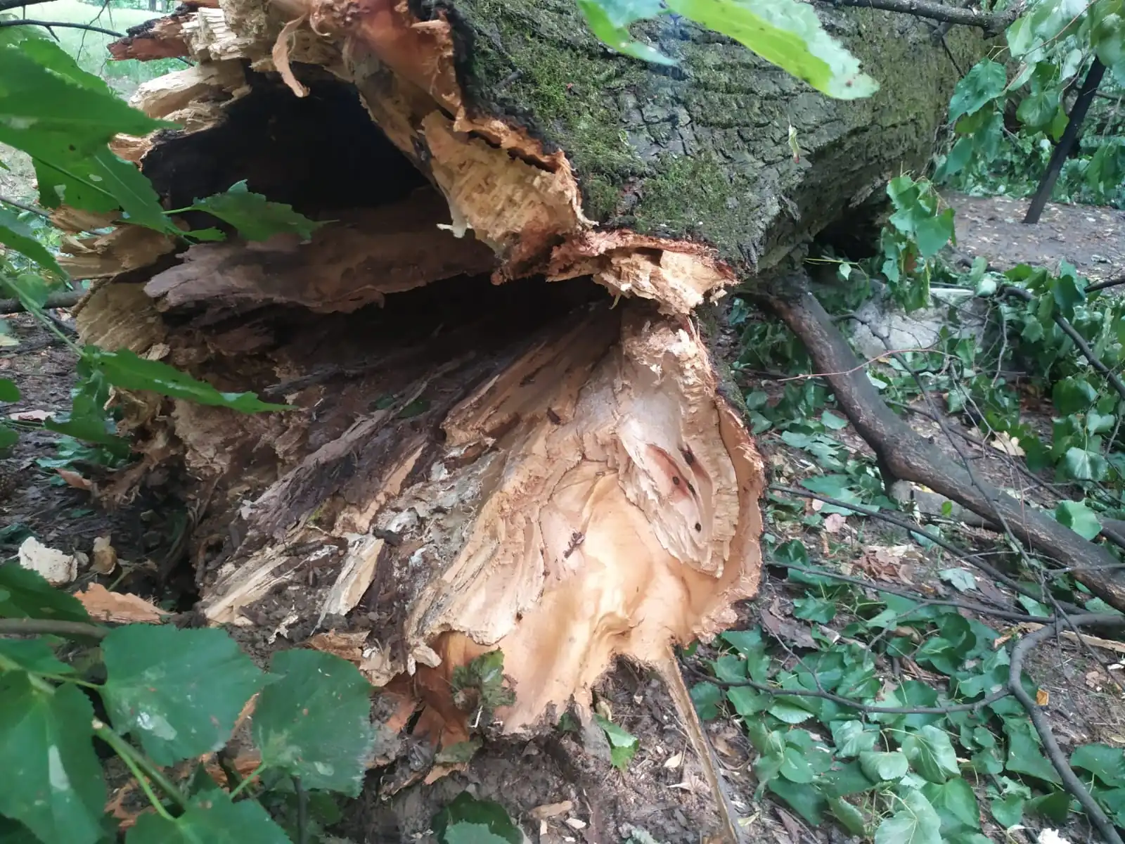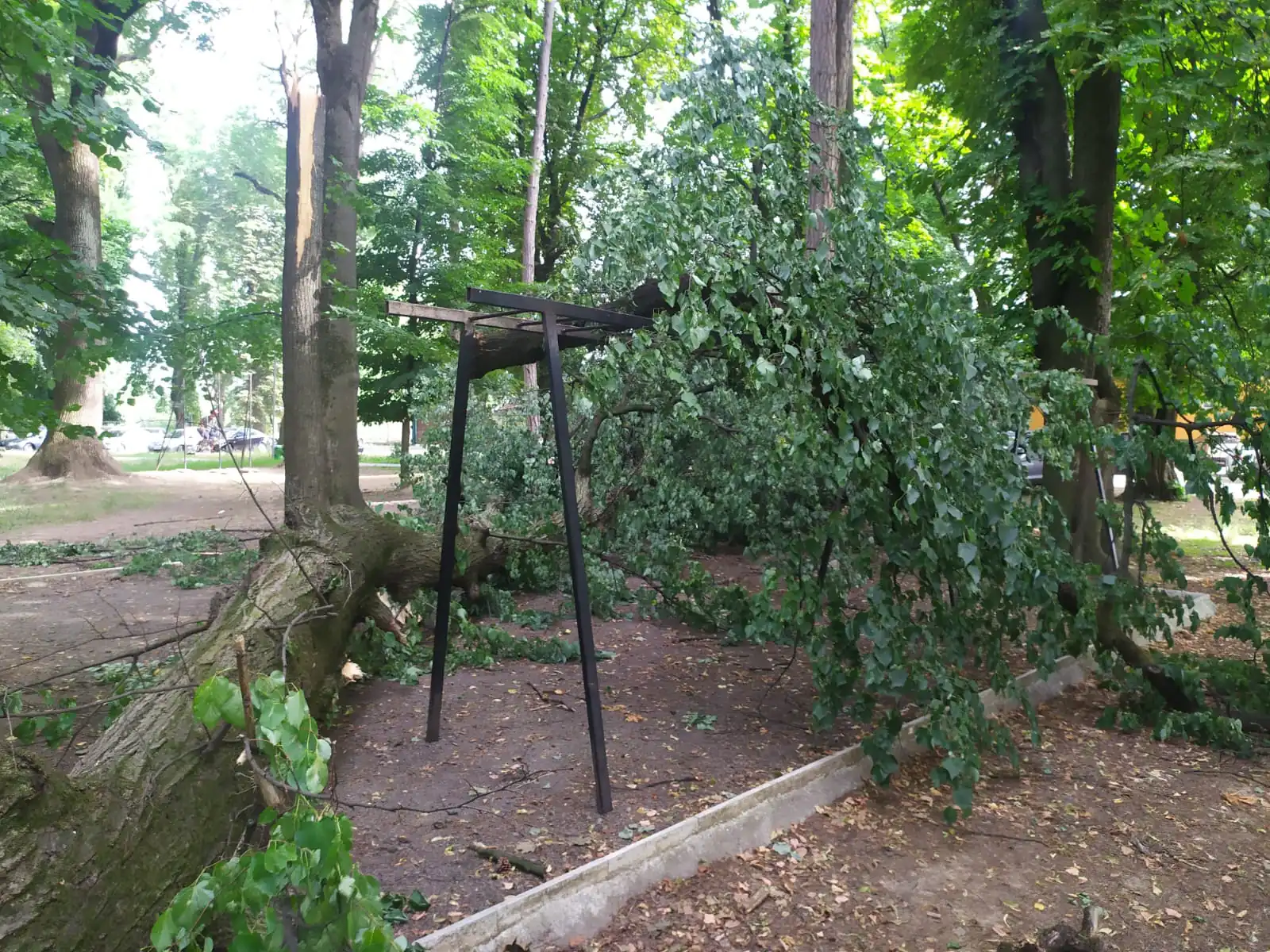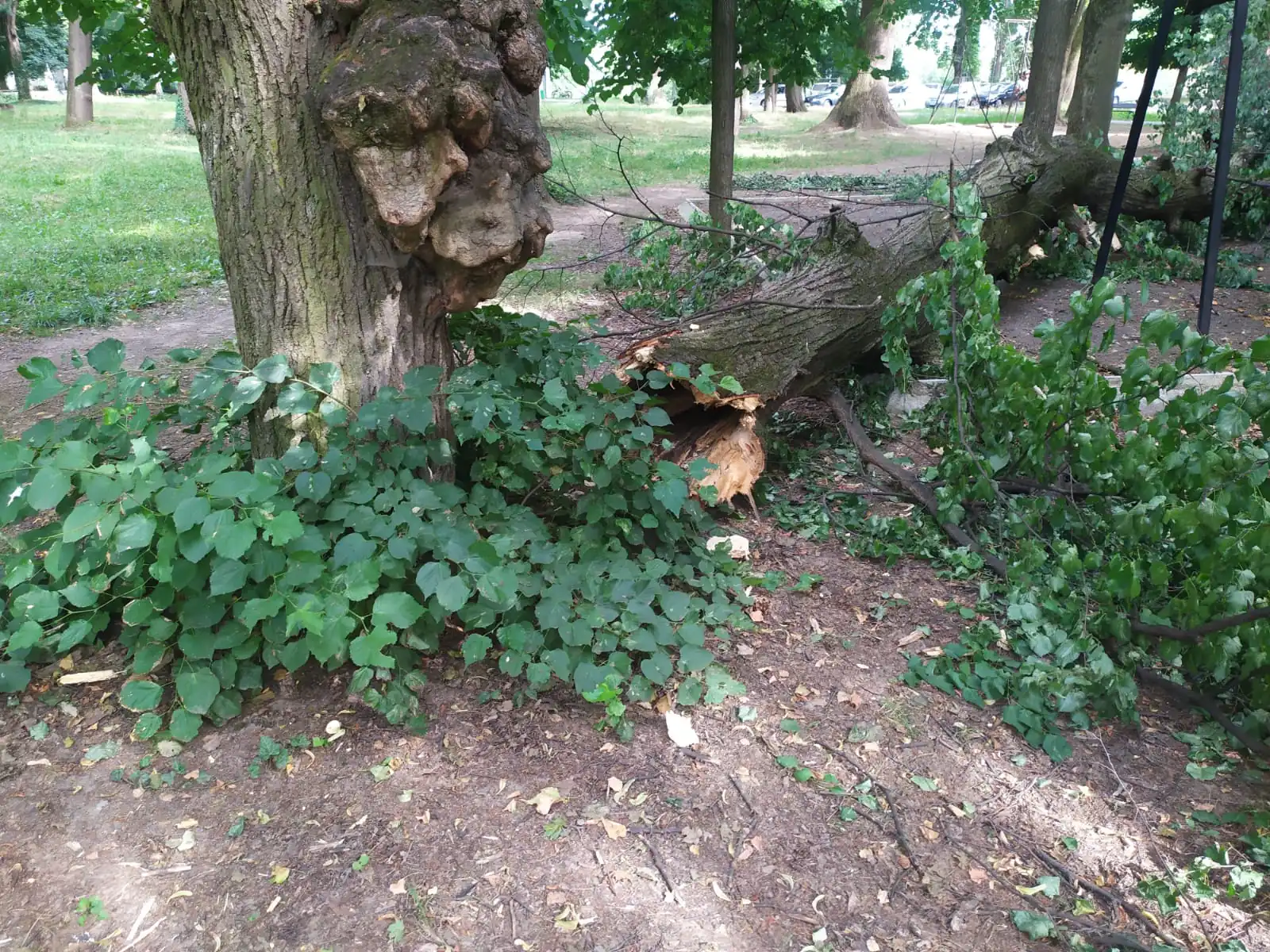 Нещодавня негода також повалила кілька старих дерев у парку (теж є на фото), їх уже прибрали та порізали. Комунальні служби, які працюють із зеленими насадженнями, проводять лише санітарну обрізку, а якщо зрізають, то тільки аварійні, сухостійні, потенційно небезпечні дерева.