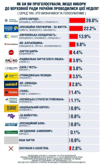 Про це свідчать результати соціологічного опитування, проведеного Інститутом аналізу та прогнозування з 11 по 23 вересня. Так, партія "Слуга народу" (Д.Арахамія, О. Корнієнко, Р. Стефанчук) набрала б 26,0%, "Опозиційна платформа – За життя"(Ю. Бойко, В. Медведчук, В. Рабінович) - 22,2%, "Європейська солідарність" (П. Порошенко) - 13,9%, ВО "Батьківщина" (Ю. Тимошенко) - 9,8%. "Партія Шарія", за даними соцопитування, знаходиться біля прохідного бар'єру - 4,4%.