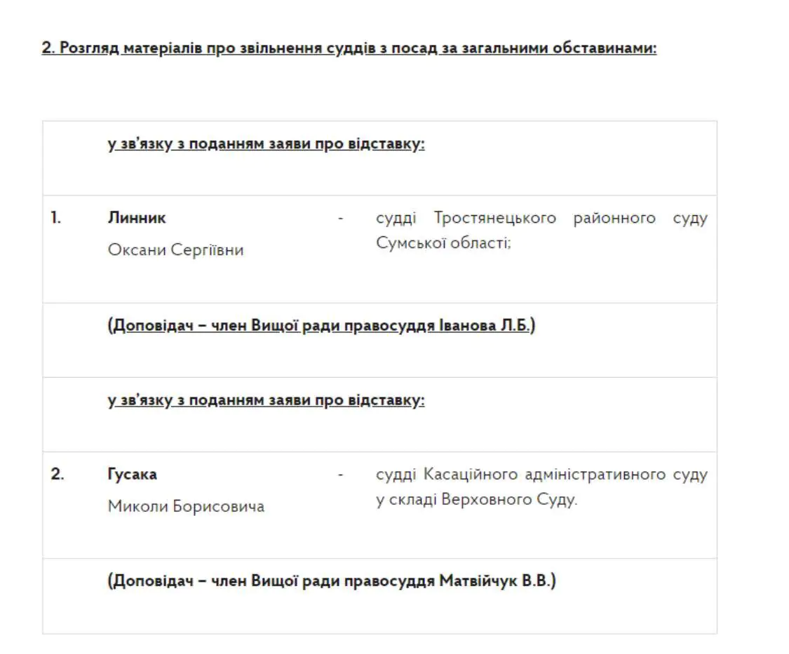 У відставку подав суддя Верховного Суду Микола Гусак. Про це стало відомо з порядку денного засідання Вищої ради правосуддя, запланованого на 7 вересня. Відомо, що Гусак обіймав посаду судді Касаційного суду в складі Верховного суду.