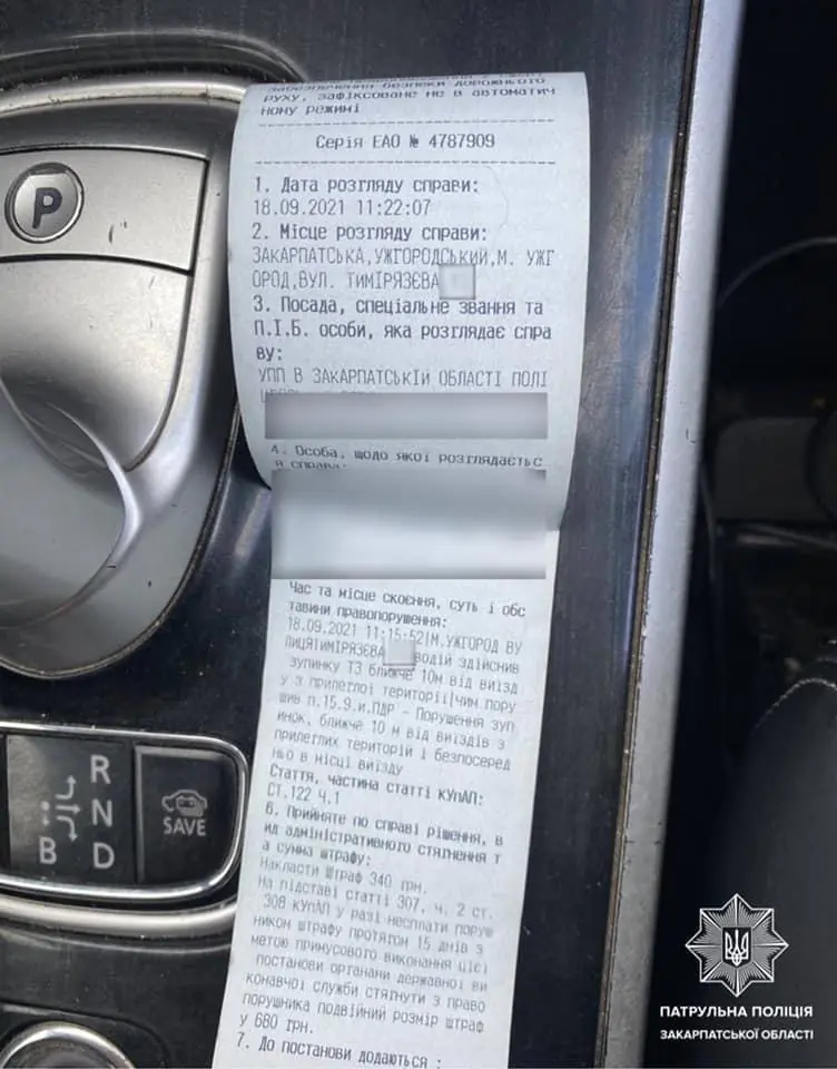 Відомо, шо водій припаркувався менш ніж за 10 метрів від виїздів з прилеглої території тим самим порушивши ПДР.