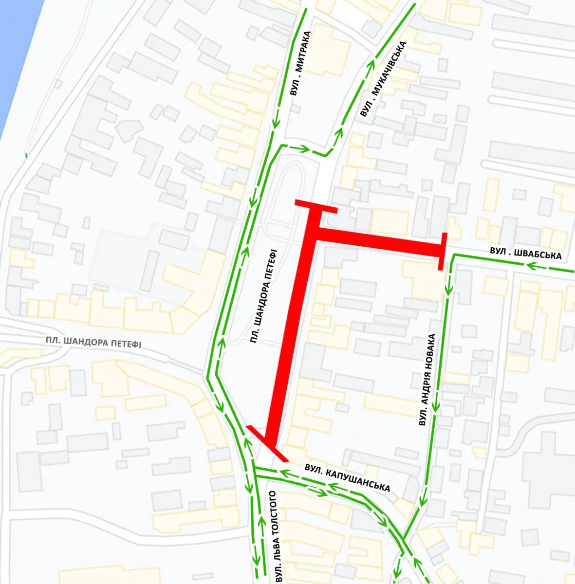 Одночасно буде влаштовано двосторонній рух ділянкою пл. Шандора Петефі, прилеглою до пішохідної зони (від будинку №6 на вул. Льва Толстого до будинку №3 на вул. Олександра Митрака).