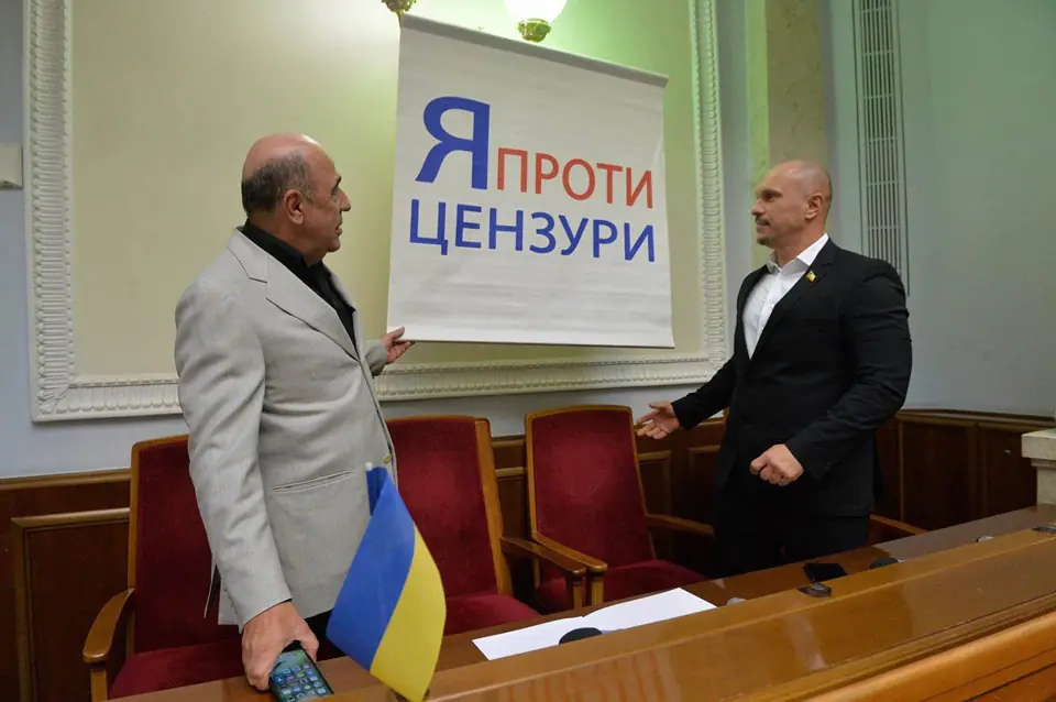 «У цій залі часто розвішували плакати на підтримку тих чи інших людей чи ідей – дозвольте і мені завершити свій виступ таким же вчинком – розвісити плакат «Я проти цензури», який нагадуватиме нам про те, що без свободи слова немає демократії, без свободи слова – немає держави!» – резюмував Вадим Рабінович.