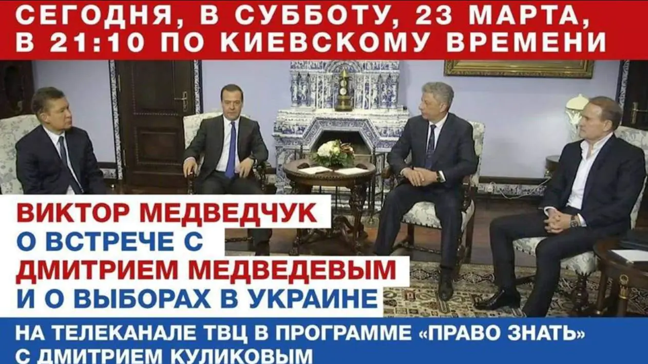 У суботу, 23 березня, о 21:10 на телеканалі ТВЦ у програмі «Право знати» з Дмитром Куликовим Віктор Медведчук розповість про важливі переговори та про хід виборів в Україні